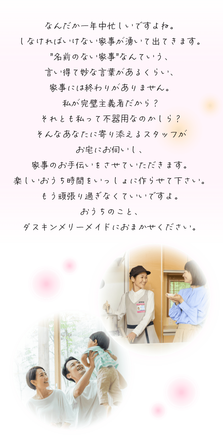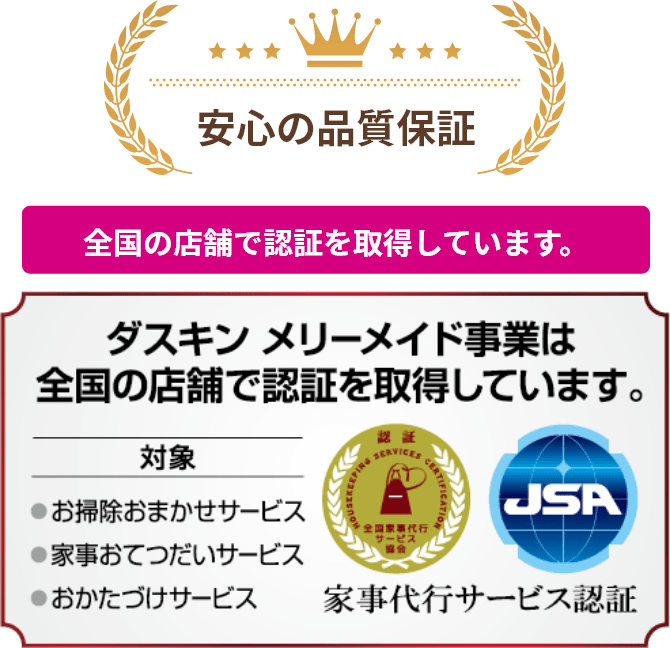 【個人情報の取扱いについて】 お預かりした個人情報は、フランチャイズチェーン加盟店にて無料お見積りの受付及びお見積りに必要なご連絡に利用させていただきます。個人情報に関するお問い合わせ、ご自身の個人情報の開示・訂正・利用停止につきましてはダスキン不二美メリーメイド 042-749-8929 までご連絡ください。
